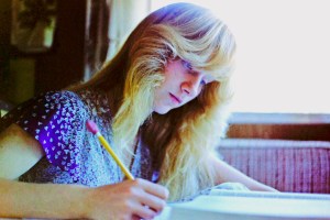 There was only one that I knew of. She never wanted to be in any pictures, and was pretty adamant about that, but one day, that spring that I fixed the car for her, we were doing homework in the camping trailer my parents had. I was fiddling with my mom’s Yashica rangefinder 35mm camera. It took a bit to learn how to focus a rangefinder camera, which was achieved by getting two images to line up one over the other, and once you figured it out, it took some practice to get any image in focus. So I told Jill all I was doing was checking the focus, but inside, I really wanted at least one picture of my friend – and I was able to capture the only picture I have of her, doing her algebra homework after school one day.