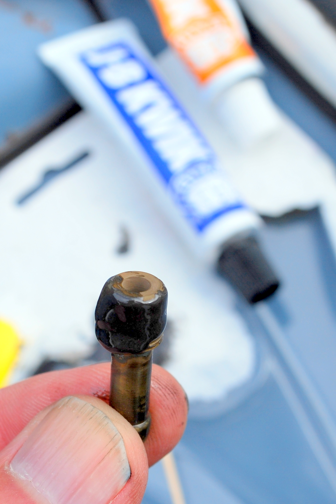 I dried the fuel pump with a paper towel (some gas had spilled before I could get the little screwdriver bit in there, then grabbed a toothpick, the JB Weld, and mixed a little onto the card it came with, and then coated the brass fitting rather liberally with the mixed JB Weld.
