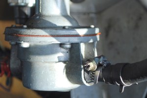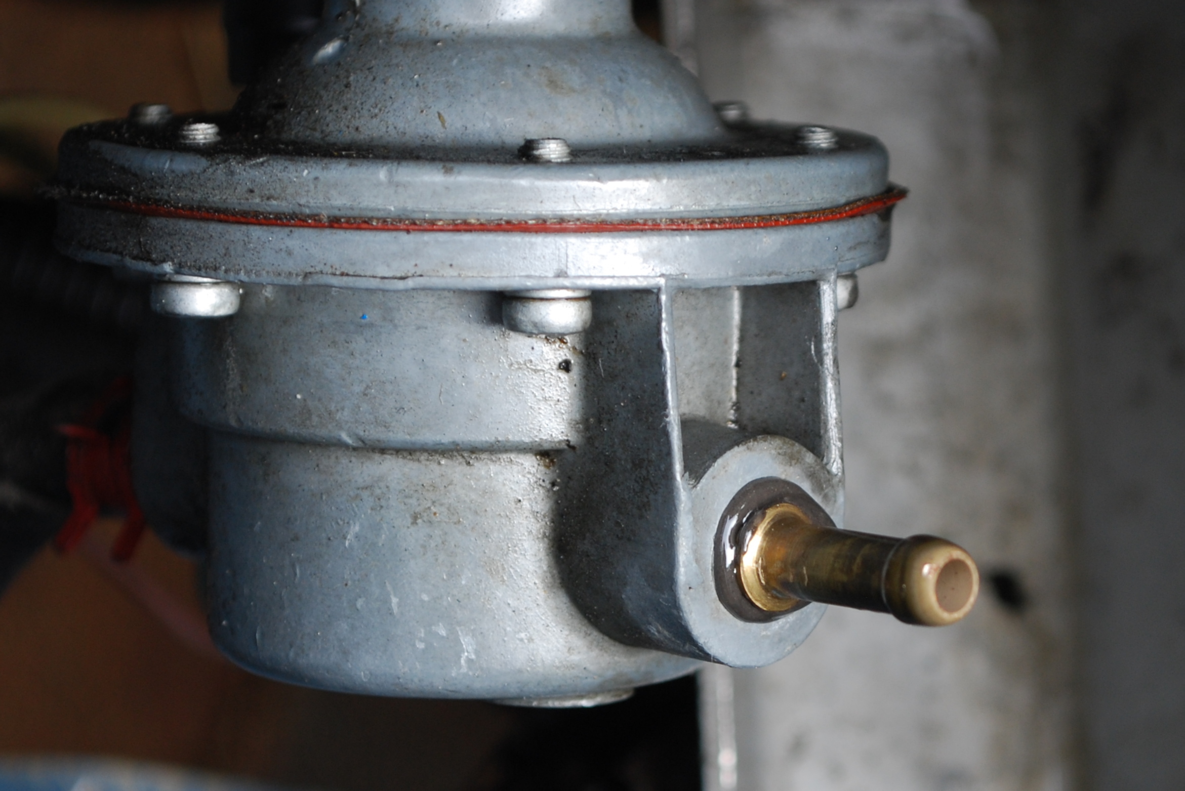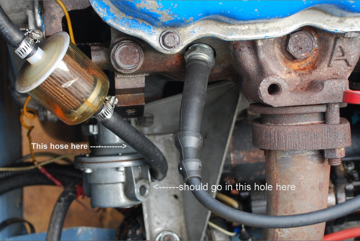 It seems that at the 4500 RPM I was going as I was blasting up the hill, the brass fitting the fuel line coming out of the fuel pump let go. You can see the fuel filter in the top left of the frame. The hose going down to the right drapes over the fuel pump.