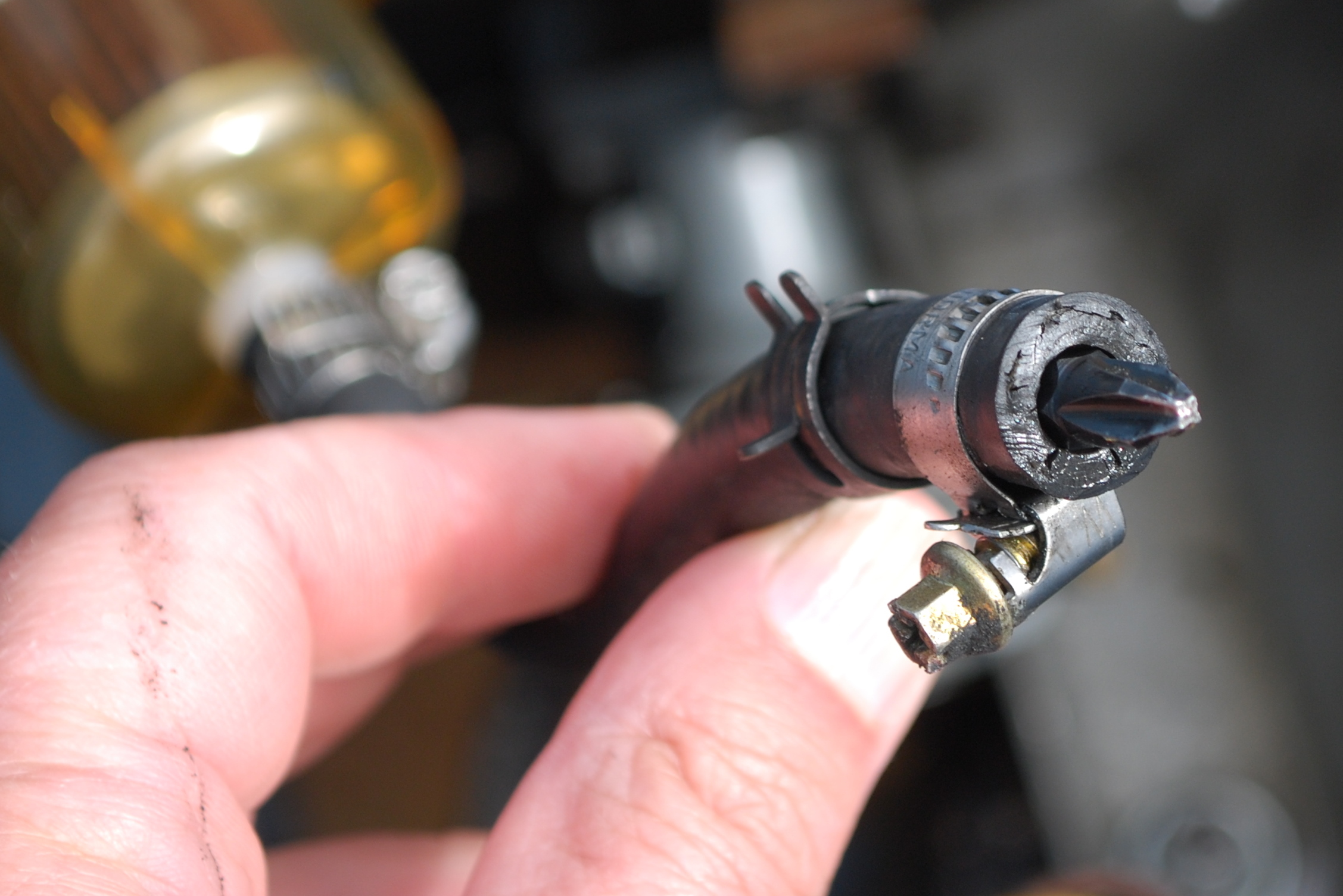So last Sunday morning, before church, I pulled the fuel line out, including the little brass fitting, and then pulled the fitting from the fuel line. Since I had a formerly full tank (I’d just filled up before this happened). I jammed a screwdriver bit into the end of the fuel line and tightened the hose clamp to keep it from spilling too much more while I worked on it.